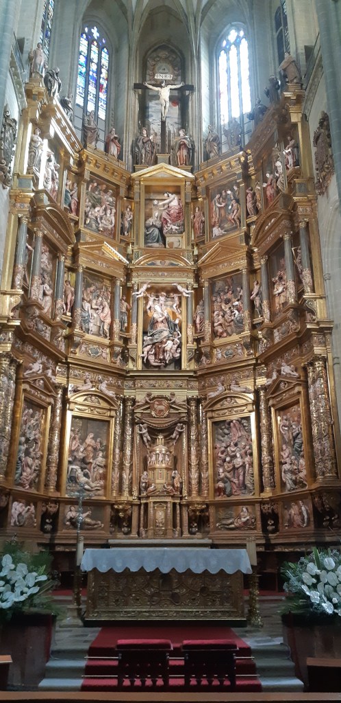 Such safety in constriction in the cathedral in Leon. A wedding was taking place that day. The weight of constriction in the lives of the bride and groom was stultifying. The images of babies and cherubs carved in plaster and wood writhing like innards on the walls were all the stuff of the human ego – lacking awareness of any other nature beings entirely. Such self focus creates constriction and is like the Devil in the Tarot cards. Such constriction permits excitement in the heat. It creates energy when energy has dissapated in the heat. Such constriction is as harsh as the burning sun. There are so many railings and jails set up inside the cathedral, movement is constricted and controlled. The wooden carvings of the inner place of the “choir” were suffocating. The only thing I sort of liked was the statue of the Virgin of Guadelope.